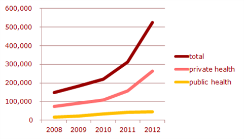 ○ 터키 보건의료시설 대폭 확충 추세 지속 - 터키 내 병원 수는 보건부 산하 병원 854개, 민간병원 550개로 확충(2013년 현재) * 이외에도 4095개의 독립 랩과 1만9627개의 내과 클리닉이 운영되고 있다고 함. - 최근 보건의료 개혁 후 민간병원에서도 사회보장제도를 적용받게 돼 민간병원의 수가 증가하는 추세임. - 터키 의료시설의 총 병상수 약 20만 대로 해마다 1~2% 증가 추세 - 의료시설의 수가 아직 부족한 수준으로 향후 지속 확충 추세